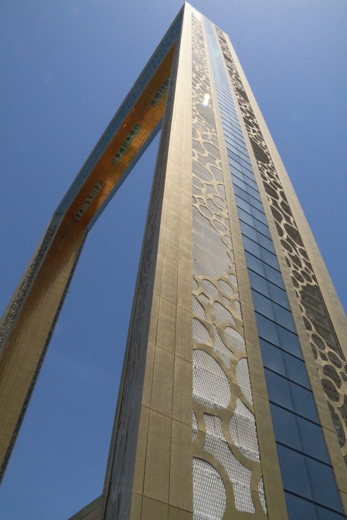 Dit is een gebouw in de vorm van een schilderij- of fotolijst. Vanaf het metrostation was het best nog wel een stuk lopen, een half uur wandelen in 35 graden is best pittig. Maar aangekomen bij het Dubai Frame was het wel de moeite waard. De buitenkant was al mooi om te zien.