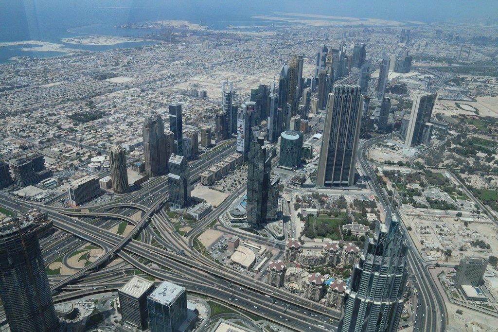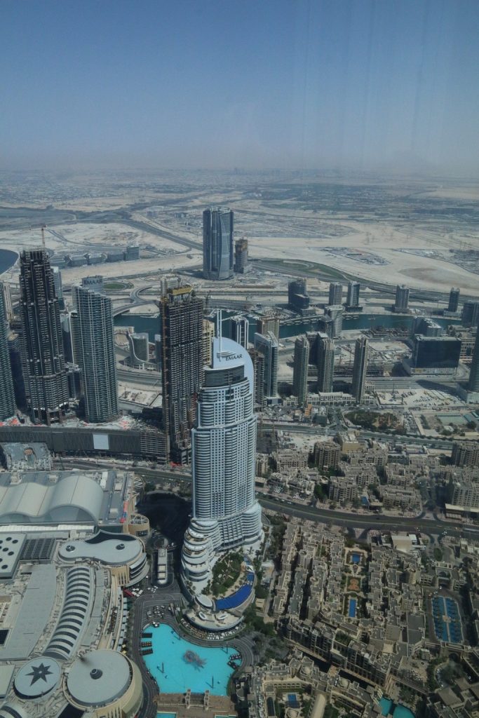 We namen de lift snel naar boven, waarbij we gelukkig net voor een schoolreisje waren, wat een hoop wachten scheelde. Boven in het gebouw had je een prachtig uitzicht. Aan de ene kant naar het oude Dubai, aan de andere kant naar het nieuwe gedeelte met alle wolkenkrabbers. Ook kon je naar beneden kijken door de glazen platen in de vloer waar je ook overheen kon lopen.