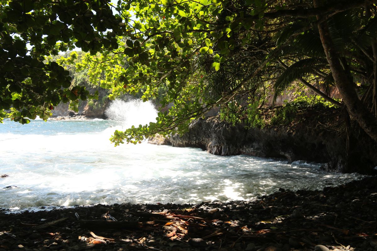 Het was wel een leuke slingerweg door de jungle en we kwamen bij een punt waar je je auto kon parkeren en via een afdaling in een soort baai kon komen.