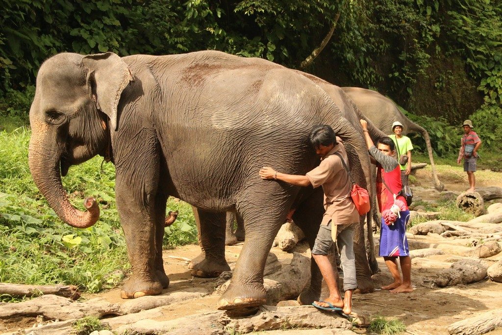 Er was een touwtje gespannen tussen de olifanten en de mensen, terwijl één van de rangers een totaal onduidelijke uitleg gaf. Wat in ieder geval wel duidelijk was, was dat een touwtje een olifant niet tegen hield, dus toen er weer één op avontuur wilde tussen de mensen, gaf dat een hoop hilariteit. Toen ook nog één van de olifanten zijn tweede slurf liet zien, was de sfeer helemaal opperbest.