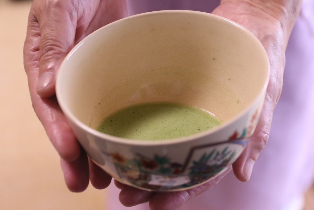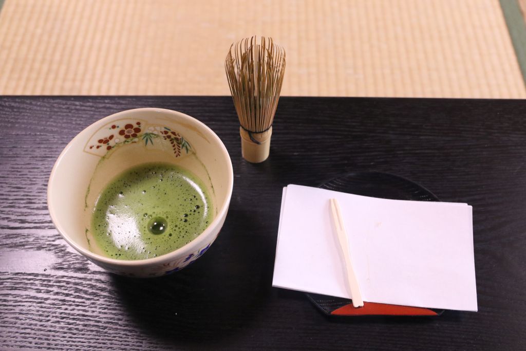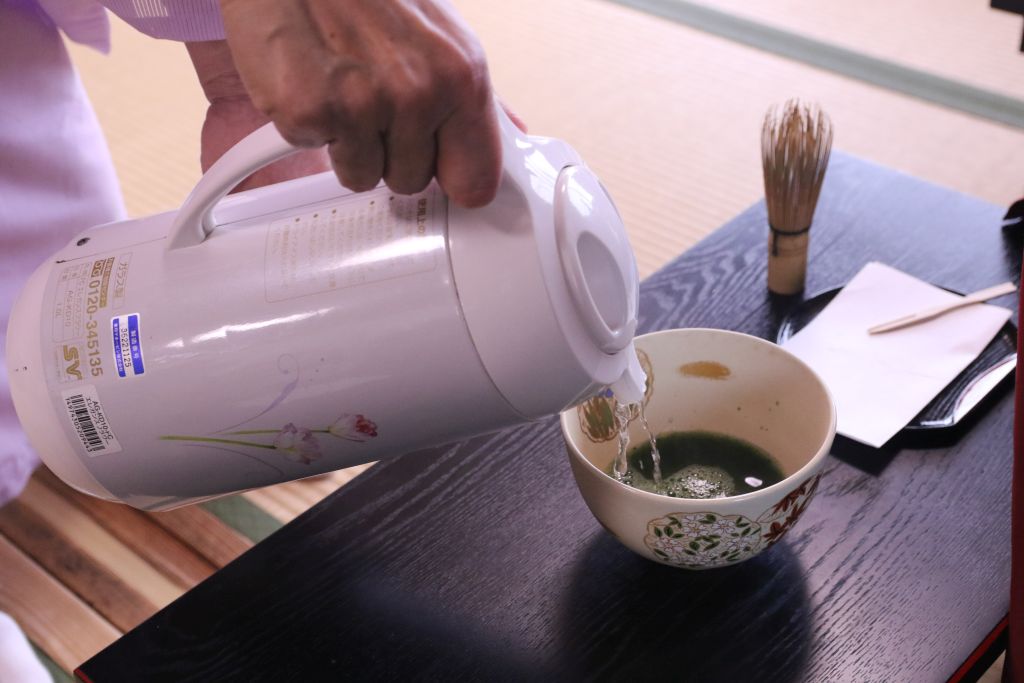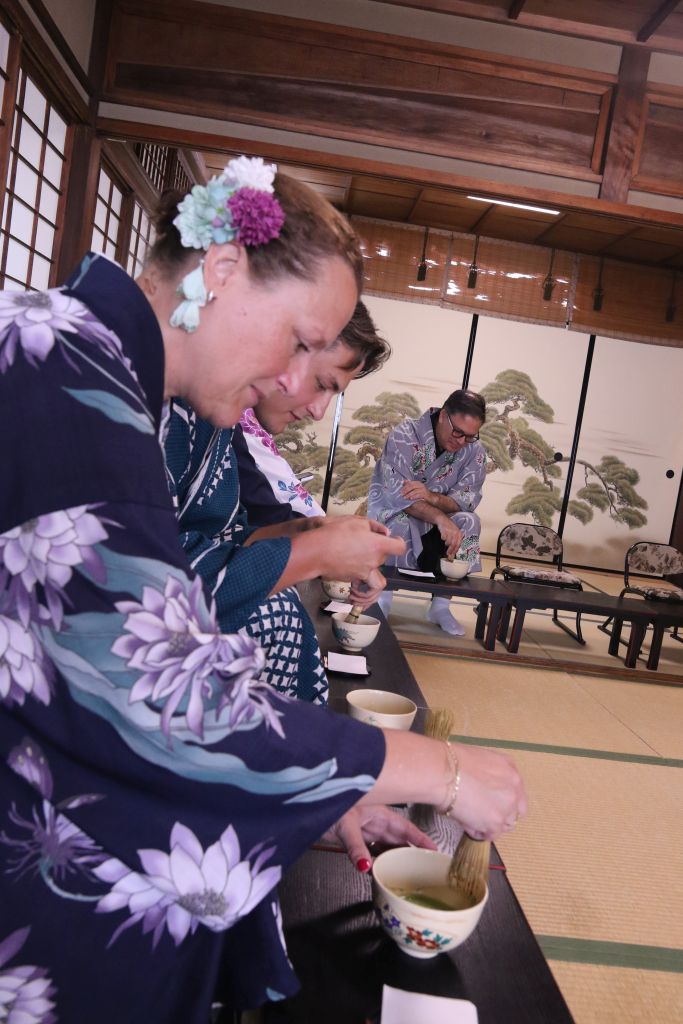 We moesten zelf de thee maken nadat de theedame heet water bij ons matchapoeder had geschonken (uit de ceremoniële thermoskan). We hadden een soort bamboeborstel waarmee we moesten kloppen totdat er schuim op de tijd bleef staan.