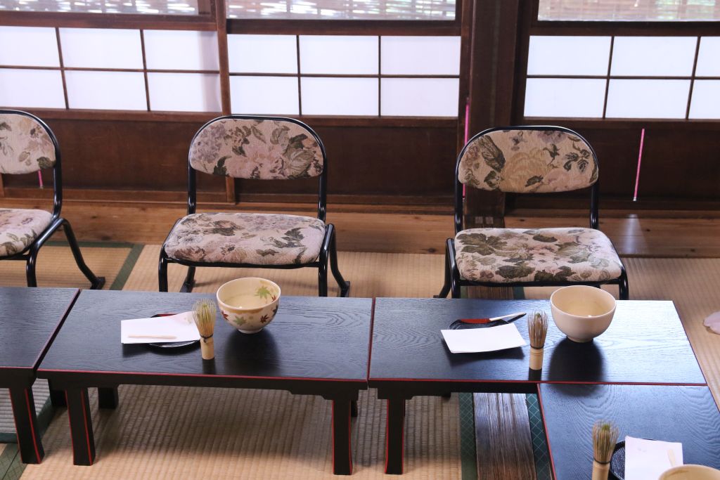 Goed, we kwamen allemaal weer samen als Temu Japanners en gingen richting de theezaal. We namen plaats op lage stoeltjes achter een laag tafeltje en waren er klaar voor.