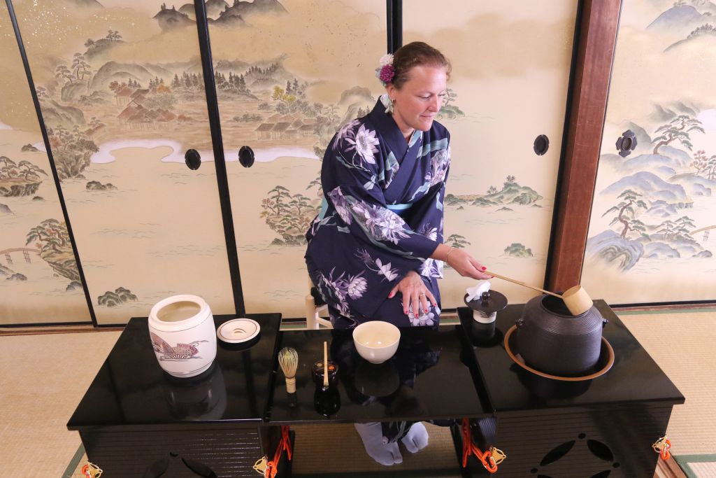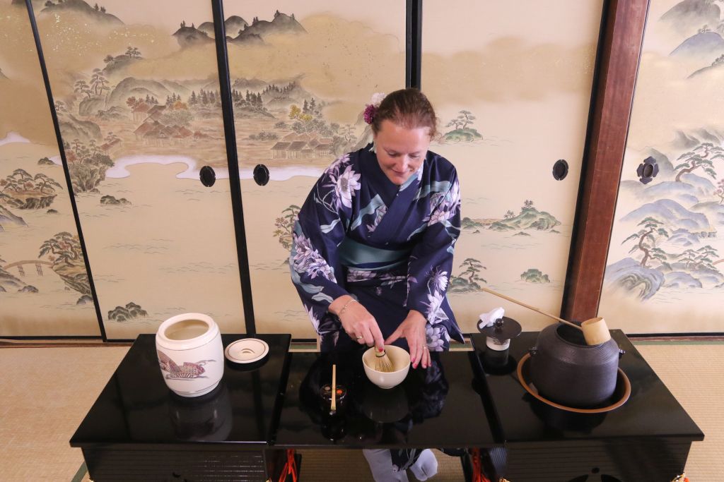 De eerste stop was het bijwonen van een traditionele theeceremonie. Daar wordt hier een hele (g)heisa van gemaakt.