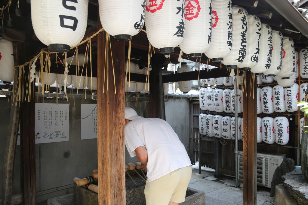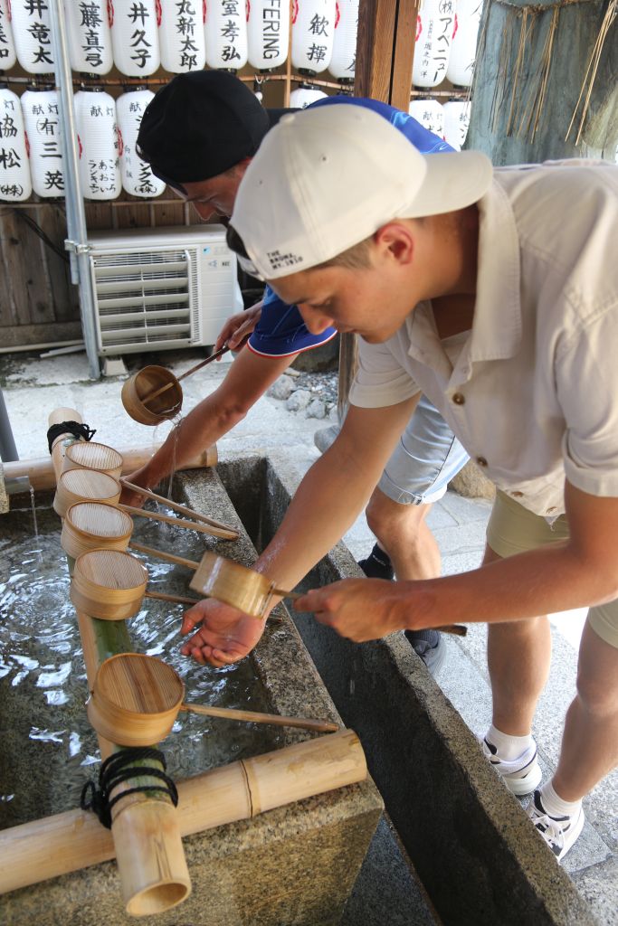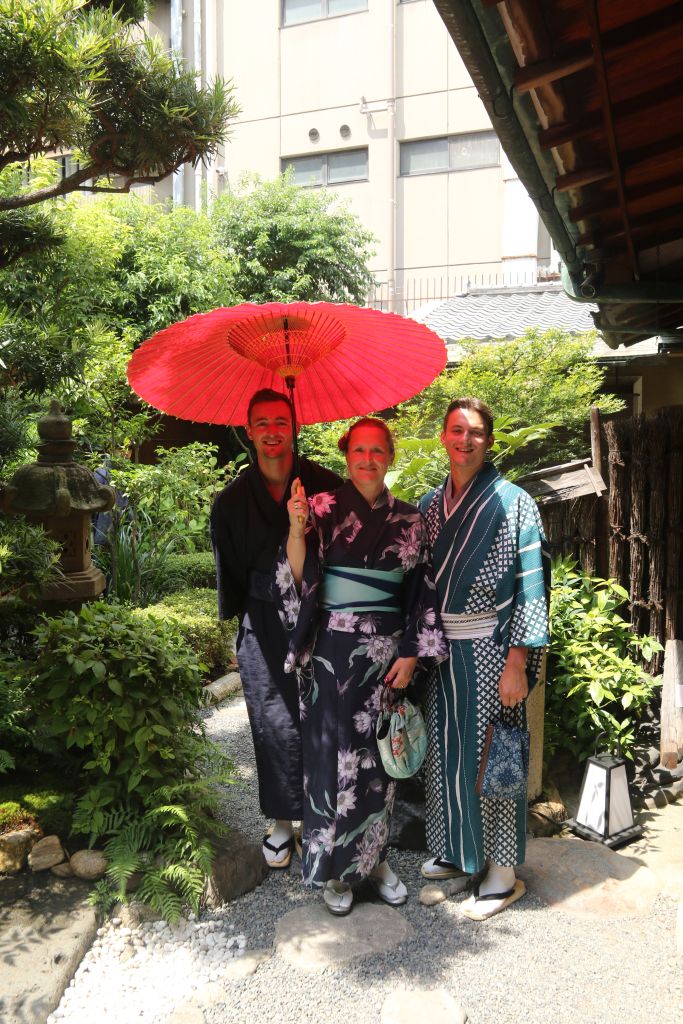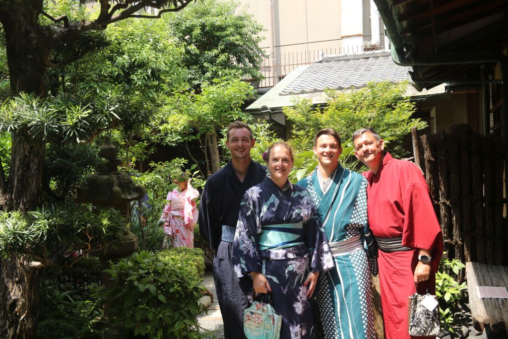 We moesten een klein stukje van het station lopen, natuurlijk weer in een dikke 35 tot 40 graden, dus de warming up konden we overslaan. Het eerste wat moest gebeuren was onze transformatie tot Japanners. Cynthia moest mee naar de dameskant, de heren gingen samen naar de herenkant.