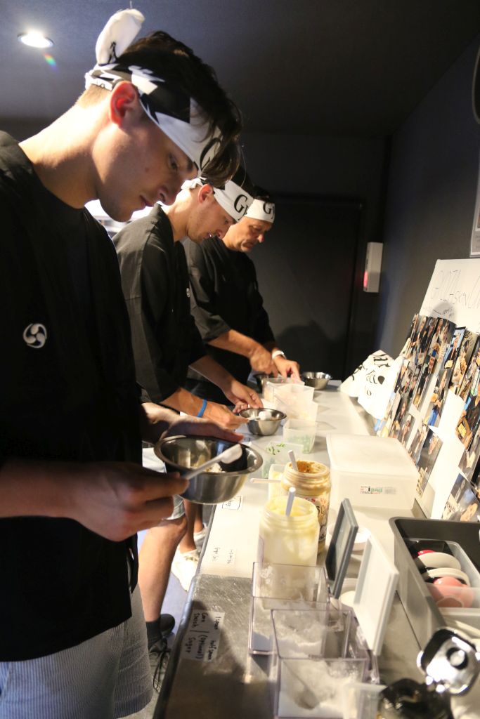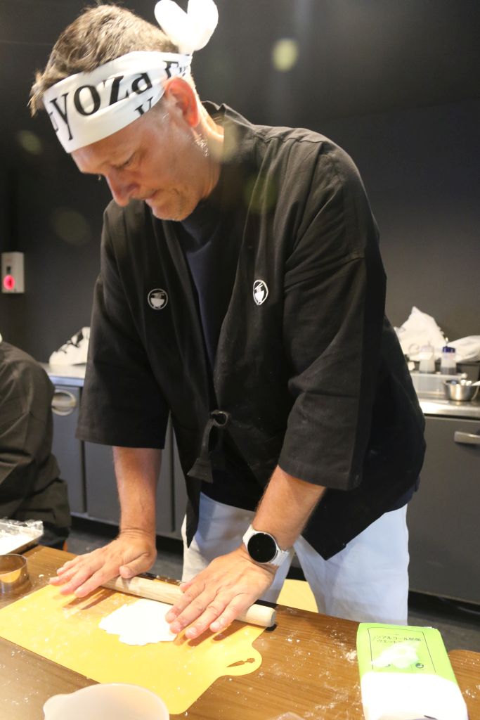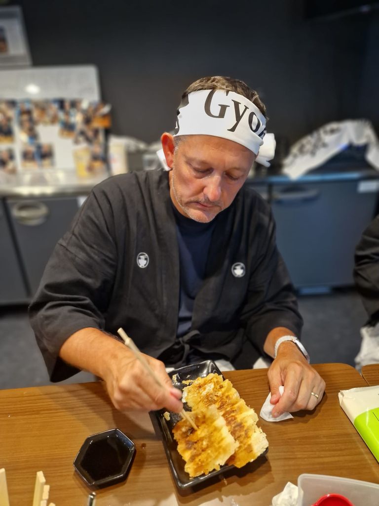 Het eten was erg lekker, en we stapten op de metro richting de Gyoza workshop. Dit keer was het minder ver lopen vanaf het station, en we kwamen ruim op tijd aan. De natte ruggen waren er niet minder om, maar op een gegeven moment raak je er aan gewend.