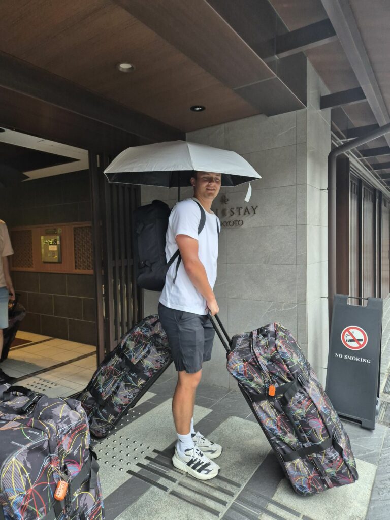 De koffers moesten we dit keer zelf naar de Takkyubin (bagagedienst) brengen. We hadden gisterenavond al even navraag gedaan, dus vol vertrouwen liepen we er heen. Het was echter de eerste dag dat we regen hadden, en best flink ook, dus we hadden paraplu’s nodig. Aangezien we 4 koffers hebben en 3 mensen om ze weg te brengen, moest er 1 iemand met 2 lopen. Als je dan ook een paraplu moet beethouden, is dat lastig. Gelukkig hadden we ook nog de rugtas gevuld met was, en tussen die tas en Damian zijn rug kon dan precies de paraplu geklemd worden. Als jongste van het gezin heb je natuurlijk het minst te zeggen.