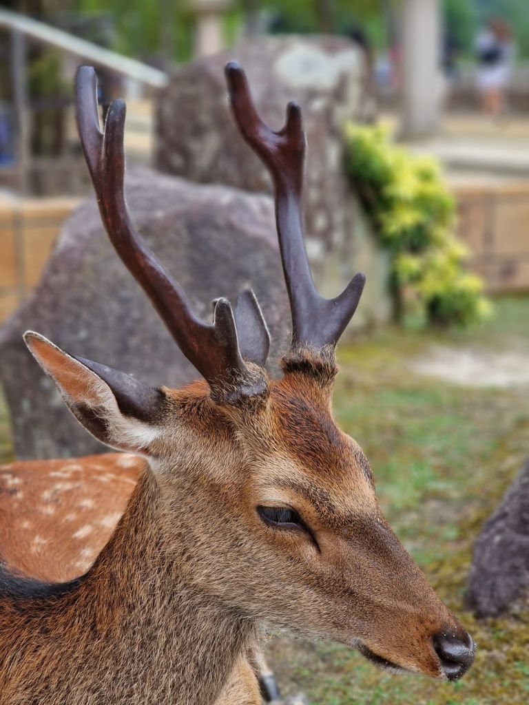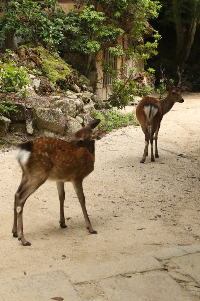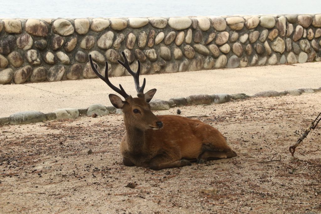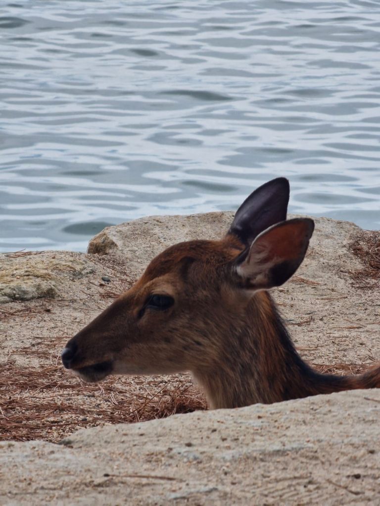 We kwamen aan op het eiland en we werden direct verwelkomd door diverse herten die hier vrij rond liepen.  Het is net als met eekhoorns bij Centerparcs, eerst is het leuk, na een stuk of 50 wordt het minder.