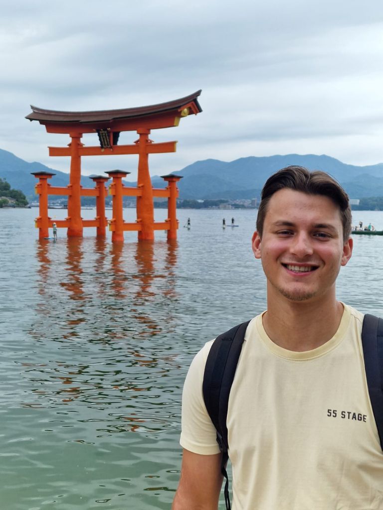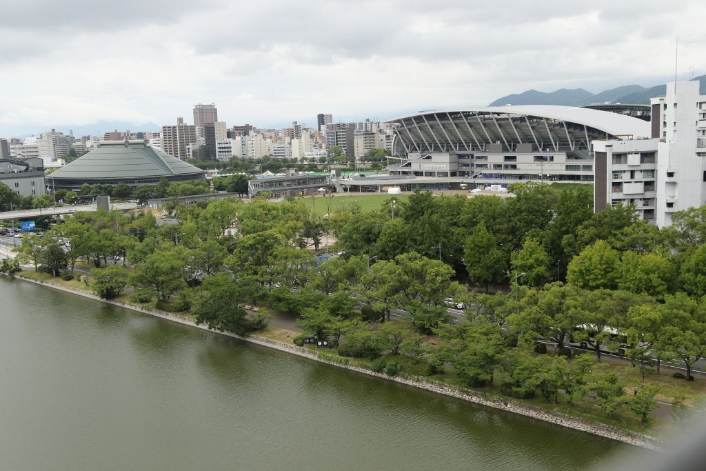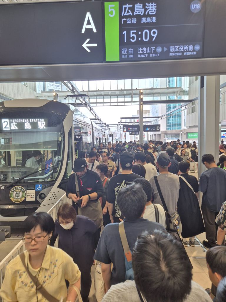 We liepen richting de veerboot, die we bijna direct opkonden, en we positioneerden ons strategisch bij de uitgang. Aan de overkant aangekomen, liepen we bijna als eerste de boot af, waardoor we als eerste bij de trein kwamen die ook weer bijna direct kwam. Hierdoor konden we prima zitten. Richard had zich alleen vergist of we beter voor of achterin konden zitten, dus op Hiroshima aangekomen zaten we precies verkeerd, dus dropen we als laatste het perron af.
