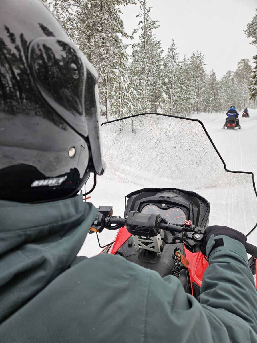 Na een korte uitleg, mochten we plaats nemen op de sneeuwscooter en gingen we op pad. De eerste 10 km was over het bevroren meer. Dit was vooral recht vooruit. Uiteindelijk gingen we het meer af, een bospad in. Dit was het echte werk, met veel bochten en hier en daar wat heuvels.
