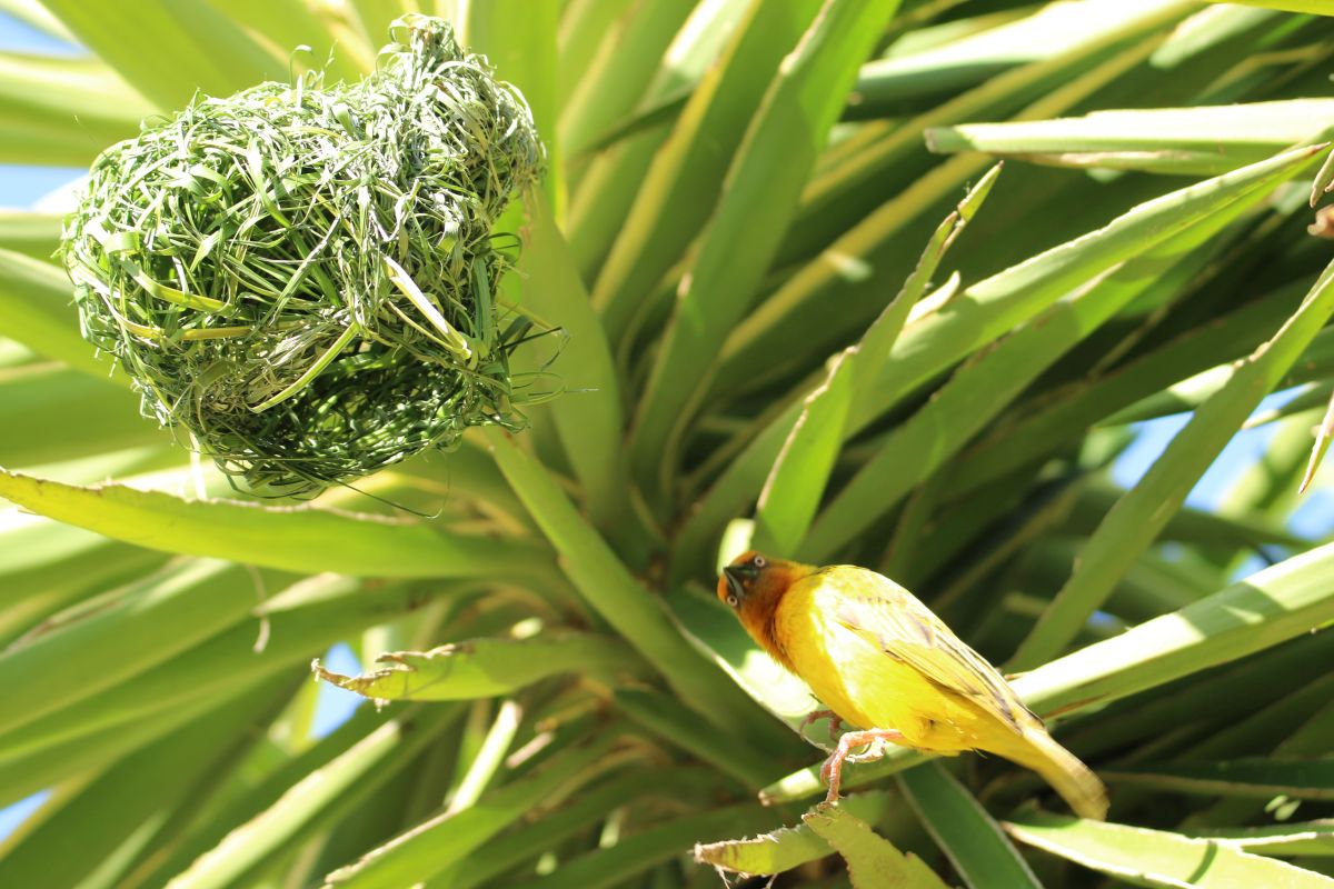 Ook zaten er naast ons huisje een paar vogels, maskerwevers, een nest te vlechten.